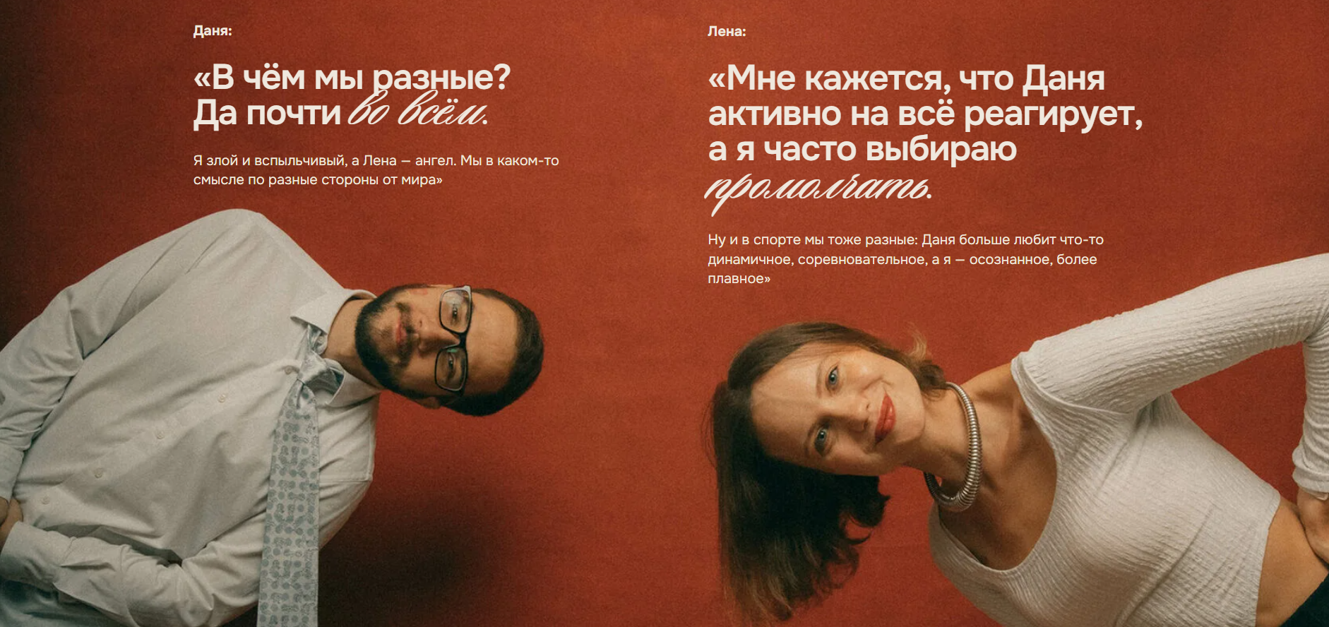 Истории влюбленных пар легли в основу рекламной кампании «Фитмоста». Команда приложения для бронирования фитнеса, красоты и релакса собрала лендинг, где «фитмостеры» отвечают на вопрос «Как найти время друг на друга спустя годы отношений?» Ответ кроется в совместных активностях.