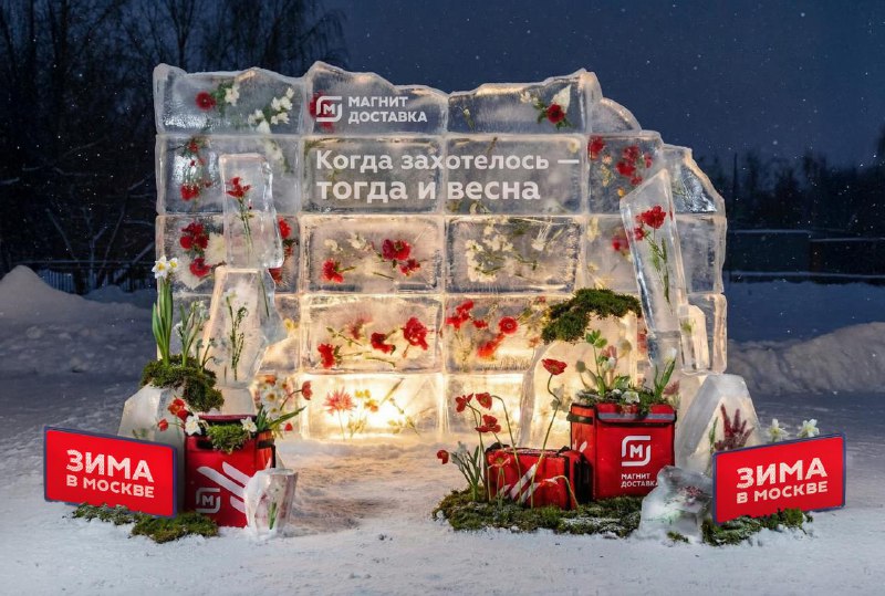 «Когда захотелось ― тогда и весна», ― говорит ледяная инсталляция от сервиса «Магнит Доставка» и креативного агентства Kitchen. Внутри композиции находятся цветы, раскрывающие метафору тепла и уюта, которое доставляет сервис.