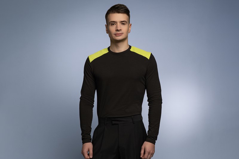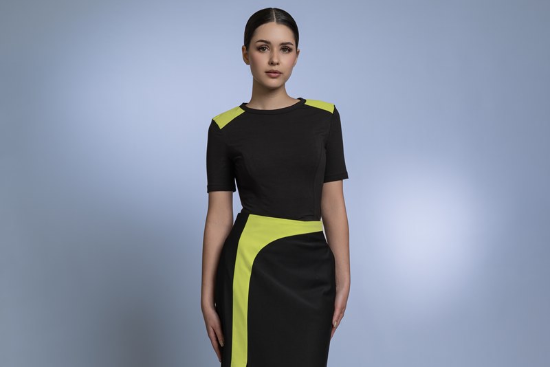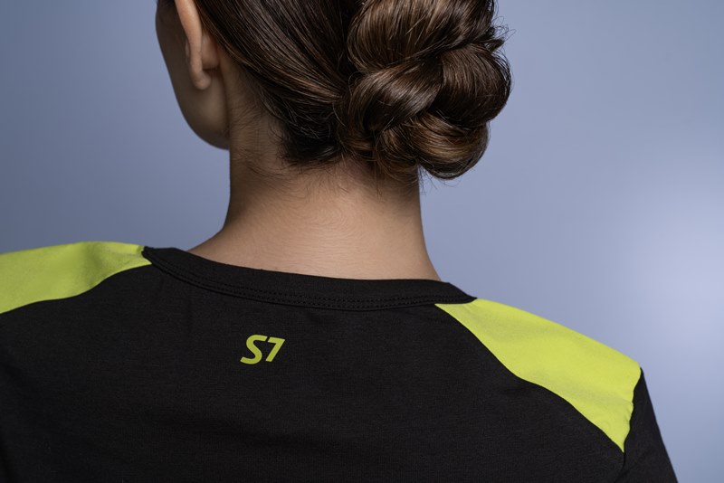 Коллекция сделана в темно-графитовом цвете. Зеленые линии, ставшие акцентом на одежде, — это метафора взлетной полосы. Автором идеи стала Мария Филева, акционер S7 Airlines, заместитель генерального директора по маркетингу и PR.