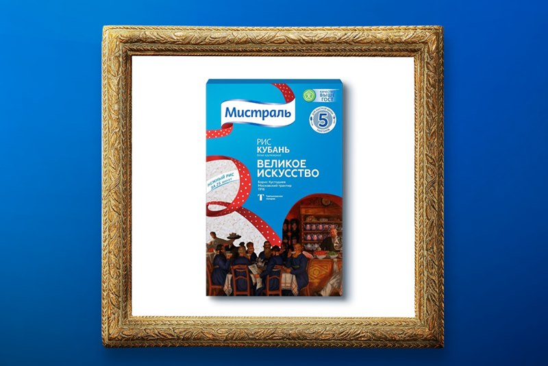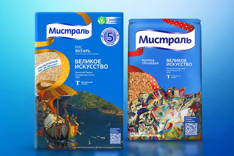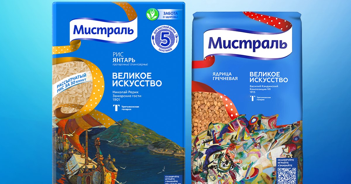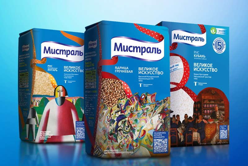 Группа компаний «Мистраль» решила продолжить свою летнюю коллаборацию с Государственной Третьяковской галереей. На этот раз на упаковках круп появились картины Кандинского, Малевича, Кустодиева. Например, «На сенокосе» и «Композиция VII».