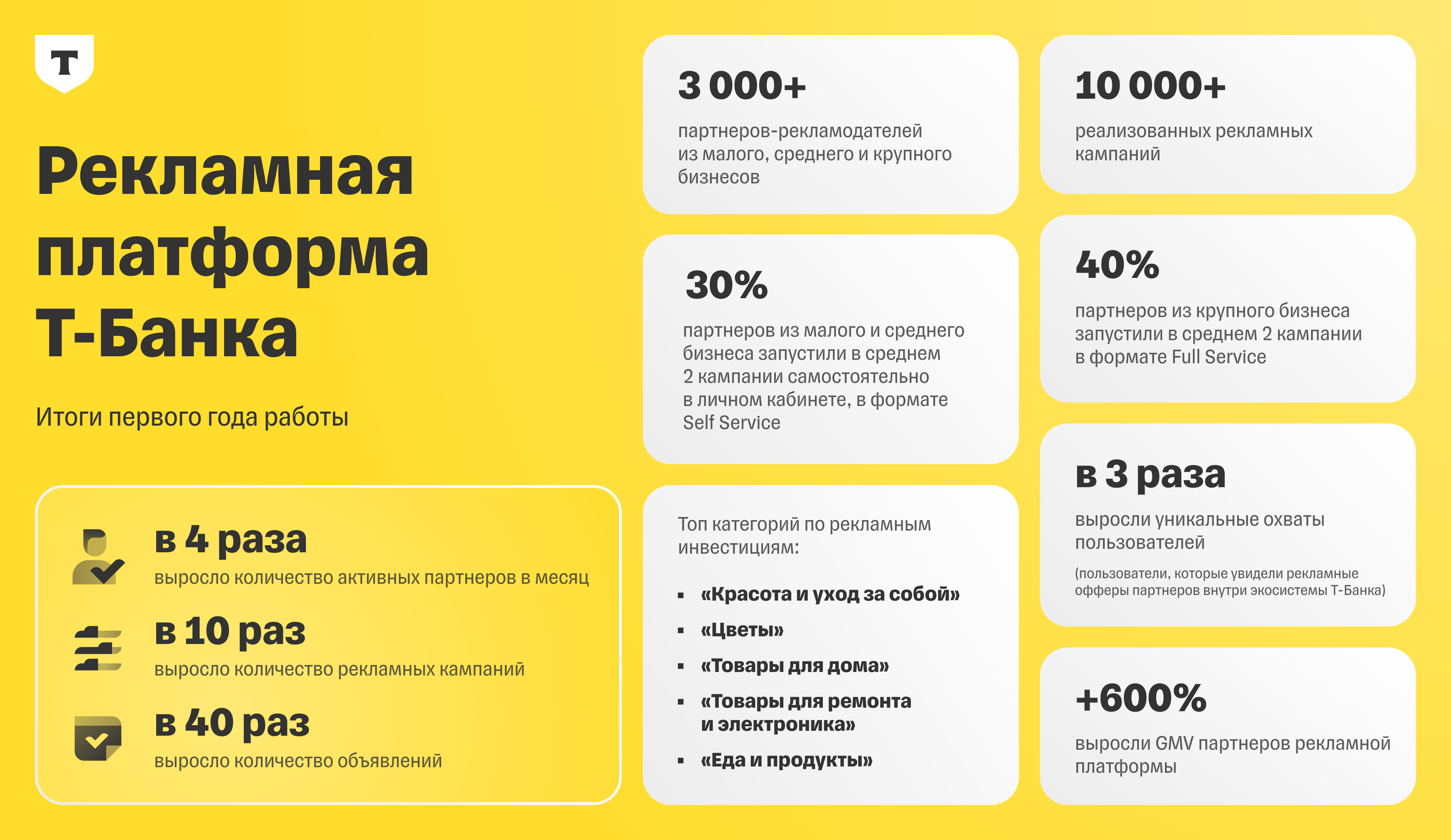 Рекламная платформа Т-Банка показала рост общего объема продаж (GMV) на 600% более чем у 3 тыс. рекламодателей по итогам первого года работы. Всего стартовали 10 тыс. кампаний, говорится в поступившем в AdIndex сообщении.
