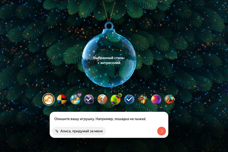 «Алиса AI» создает игрушки по текстовому описанию. Например, можно придумать балерину-медвежонка или любого другого персонажа, которого ранее не существовало. После этого игрушка «оживает». Каждый пользователь может повесить бесконечное количество украшений на елку.