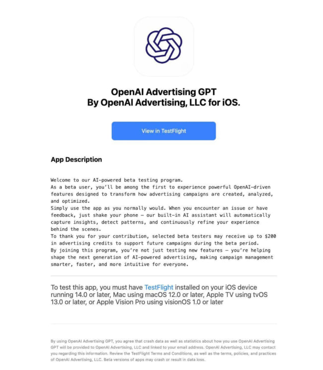 Эксперты обнаружили приложение TestFlight, которое преподносит себя рекламным провайдером Open AI (компании-создателя ChatGPT). Об этом написал PPC.Land со ссылкой на Адриана Деккера, маркетинг-специалиста по масштабированию Google Ads. Отмечается, что фейковая программа функционирует на ПО от Apple.