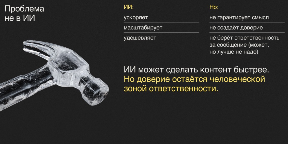 «Рынок уже прошел стадию иллюзий. ИИ действительно ускоряет работу и расширяет возможности команд, но не превращает креатив в кнопку “сделать сейчас”. Чем выше требования к качеству и доверию аудитории, тем важнее роль человека — в постановке задачи, отборе решений и финальной сборке», — рассказала управляющий директор Okkam Creative Ольга Петрова.