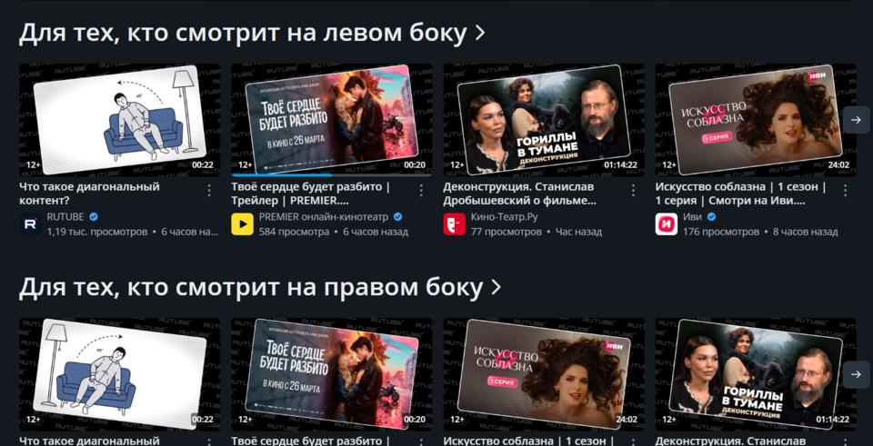 Запуск формата диагональных видео Rutube анонсировал 30 марта в своем официальном телеграм-канале. Это решение было принято в порядке эксперимента и как ответ на тенденцию, что значительная доля пользователей предпочитает смотреть видео со SmartTV лежа.Видео разделены на две группы: для тех, кто «смотрит на левом боку», и тех, кто «смотрит на правом боку».