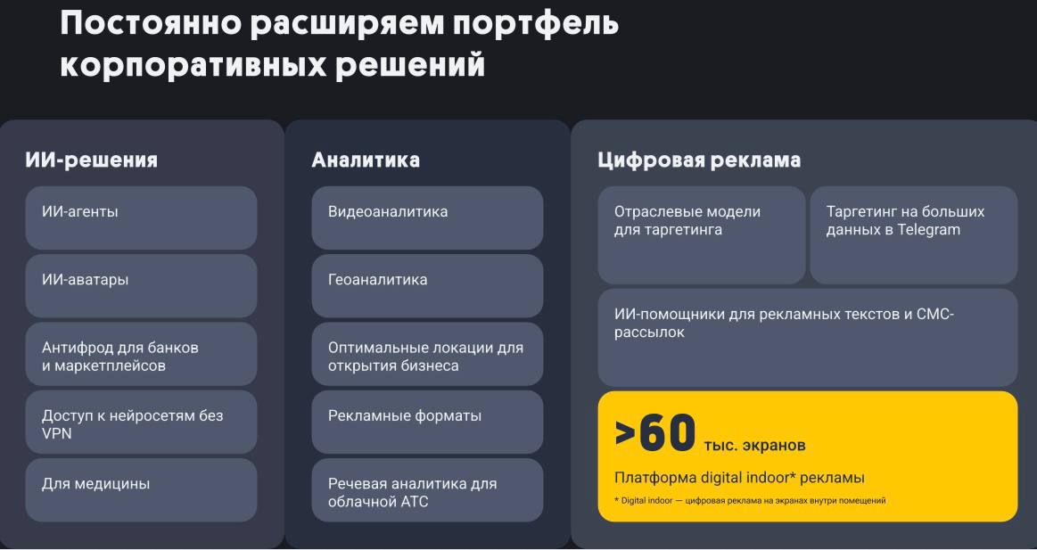 Компания постоянно расширяет портфель корпоративных решений. В сфере искусственного интеллекта предлагаются ИИ-агенты, ИИ-аватары, антифрод-системы для банков и маркетплейсов, другие сервисы. В блоке аналитики доступны видеоаналитика, геоаналитика, инструменты для определения оптимальных локаций при открытии бизнеса, рекламные форматы и речевая аналитика для облачных АТС. В области цифровой рекламы разработаны отраслевые модели для таргетинга, ИИ-помощники для создания рекламных текстов и СМС-рассылок. Компания развивает платформу диджитал indoor-рекламы, которая насчитывает более 80 тыс. экранов для размещения цифровой рекламы внутри помещений.