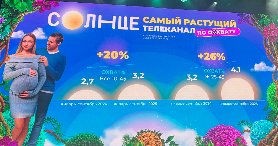 Телеканал «Солнце» поднялся в рейтинге российских телеканалов по доле аудитории, которая за год увеличилась более чем на четверть, сообщил генеральный продюсер площадки Рубен Оганесян на презентации нового сезона. По охвату, а также по аффинитивности (метрика совпадения фактической аудитории с целевой) среди женщин 25–45 лет он поднялся на более высокие позиции.