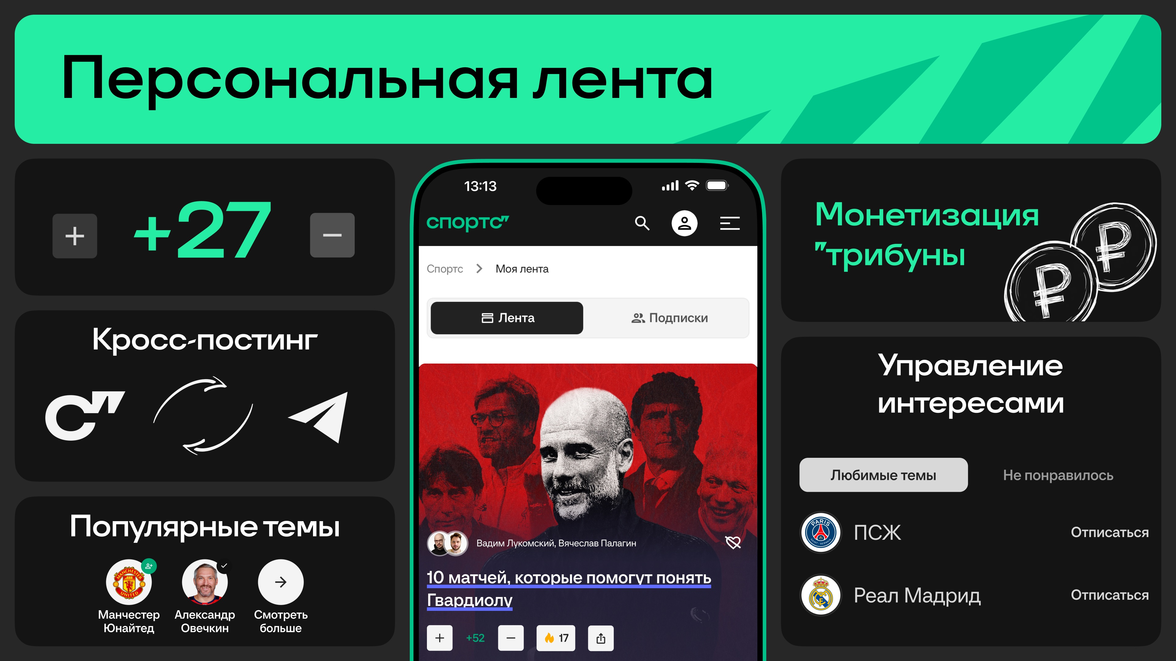 Разделом «Моя лента» теперь сможет воспользоваться каждый читатель «Спортса”». В нем объединятся посты «Трибуны», редакционные тексты и новости дня. «Пользователь может управлять рекомендациями: подписываться на любимые команды и авторов, блокировать нежелательные темы, исключать повторяющиеся посты», — заявили представители портала.