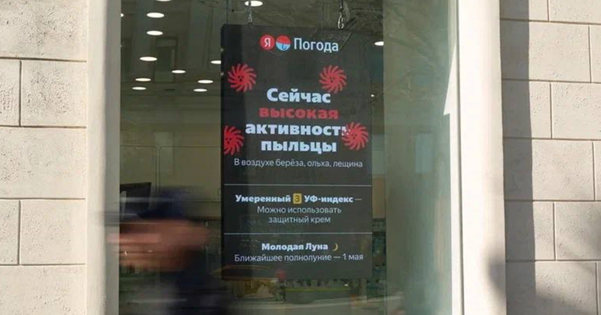 «Яндекс» начал показывать на цифровых экранах в Москве уровень пыльцы и индекс ультрафиолетового излучения. Данные появились на пилларах (уличных столбах), в витринах ретейлеров и на крышах такси. Об этом AdIndex рассказали в пресс-службе компании.