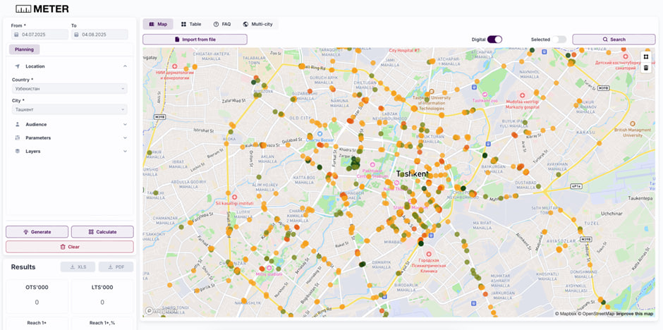 METER — независимый измеритель наружной рекламы, который работает в Центральной Азии с 2022 года и оперирует данными более чем в 20 странах. Покрытие включает регионы Центральной Азии (в том числе Узбекистан и Казахстан), Кавказа, а также ряд рынков Ближнего Востока, Европы, Азии и Африки.