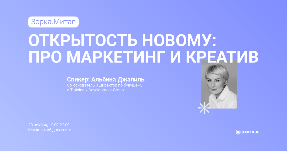 20 ноября в Москве состоится встреча для специалистов по маркетингу, креативу и коммуникациям. Тема первой встречи — «Открытость новому»: о том, как появляются идеи, почему не всегда хватает решимости им следовать и как развивать компетенцию, которая помогает расти и творить