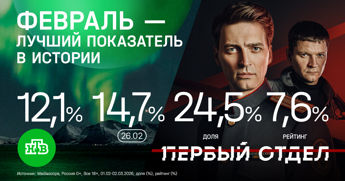 23 февраля НТВ показал лучшую долю в День защитника Отечества за всю историю измерений аудитории всей России: доля составила 13,3% среди всех зрителей старше 18 лет. А премьерная военная картина «Солдат по кличке Рекс» с Евгением Миллером в главной роли с рейтингом 6,7% возглавила топ программ праздничных выходных на всем российском телевидении. Средний рейтинг показа составил 6,3% (средняя доля 20,1%), максимальная доля — 21,4%. (Источник: Mediascope, Россия 0+, Все 18+, 23.02.2020–23.02.2026, доля (%); 21.02–23.02.2026, макс. рейтинг (%), макс. доля (%)).