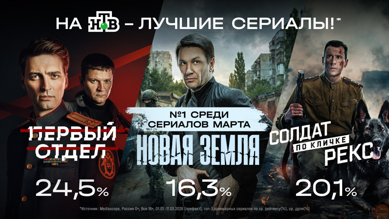Также в топ-3 премьерных сериалов 2026 года вошли военная картина «Солдат по кличке Рекс» со средним рейтингом 6,3% (долей 20,1%) и детектив «Новая земля» со средним рейтингом 4,8% (доля 16,3%). К тому же сериал, действие которого разворачивается на территории нового субъекта Российской Федерации — в Бердянске Запорожской области, стал лучшим сериалом марта. (Источник: Mediascope, Россия 0+, Все 18+, 01.01.-31.03.2026, рейтинг (%), доля (%)).