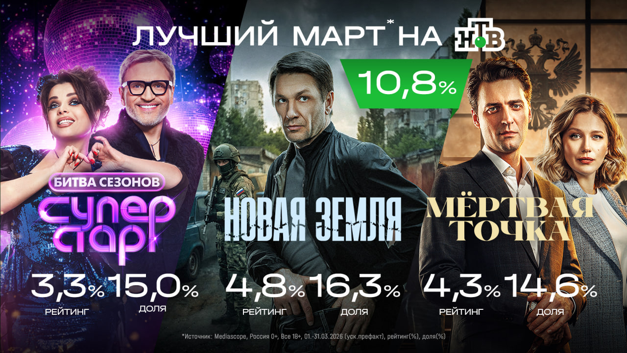 Традиционно в топе эфирных событий – праймовые шоу НТВ. Так, музыкальный проект «Суперстар! Битва сезонов» стал лучшим музыкальным праймовым шоу 2026 года со средним рейтингом 3,3% (доля 15,0%). Грандиозный финал шоу, вышедший в эфир НТВ 28 марта, прошел с долей 15,8%, максимального значения ― 25,8% ― доля достигла во время выноса кубка победителя, которым стал Шура. (Источник: Mediascope, Россия 0+, Все 18+, 01.01–31.03.2026, рейтинг (%), доля (%), макс. доля(%), макс. доля минуты(%)).