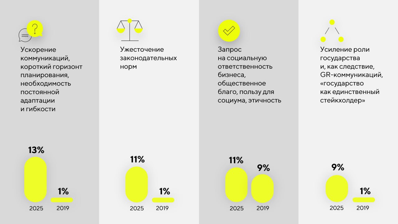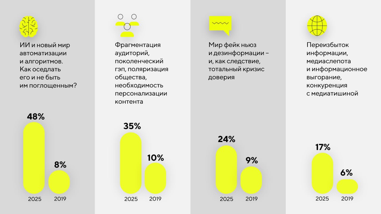 Так, сейчас почти половина опрошенных руководителей PR-подразделений и агентств (48%) считают основным вызовом искусственный интеллект. Всего за год значимость этой темы выросла в 10 раз: о ней говорили лишь 5% респондентов в 2024 г. На втором месте с результатом 35% находится фрагментация аудиторий. Доля специалистов, обеспокоенных этой проблемой, увеличилась в 2,5 раза по сравнению с 2019 г., когда она волновала только 10%. Третью позицию с 24% занимает проблема дезинформации. При этом в 2019 г. она и вовсе не входила в топ-5.