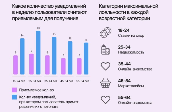 Опрошенные также отметили максимальную лояльность к отдельным категориям. Это утилиты (респонденты готовы получать от 5 до 20 уведомлений в неделю), приложения для онлайн-знакомств (от 8 до 19 уведомлений), маркетплейсы (от 7 до 17 уведомлений), государственные сервисы (от 6 до 17 уведомлений), приложения для покупки продуктов (от 7 до 16). Менее лояльно россияне относятся к приложениям категории «бьюти», играм, мобильным операторам, приложениям для автомобилистов и для путешествий, медицине и фармацевтике с точки зрения пуш-уведомлений.