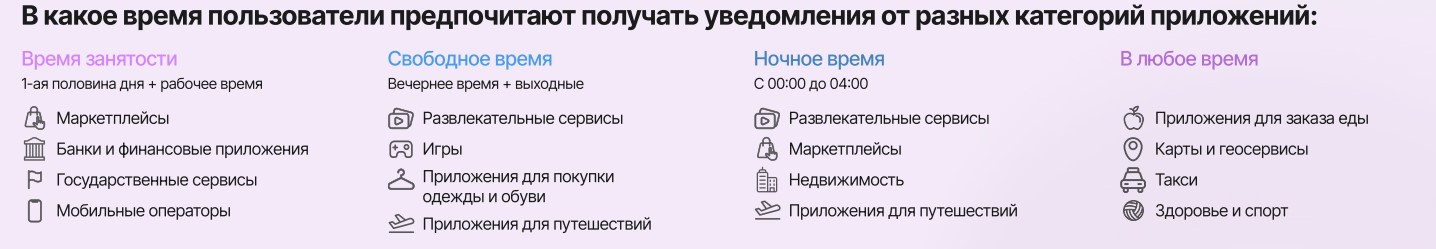 Также 23% респондентов отметили, что отключают пуши, потому что они приходят в неподходящее время. По словам авторов исследования, лучше всего присылать уведомления в рабочее время (это удобно для 24% опрошенных) либо в будние дни после работы (20%). При этом почти для трети пользователей (28%) время получения пуша вообще не имеет значения, а среди молодежи эта доля составляет 43%.