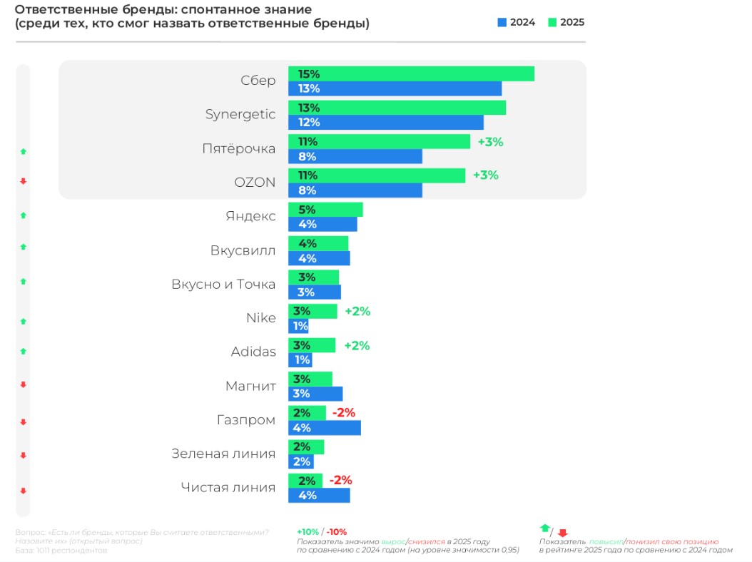 Больше половины россиян (62%) считают, что компаниям стоит сообщать о своих социальных и экологических инициативах. О нехватке такой рекламы рассказали 42% опрошенных. Вместе с этим в лидеры ответственных брендов вошли «Сбер», Synergetic, «Пятерочка» и Ozon, по мнению респондентов.
