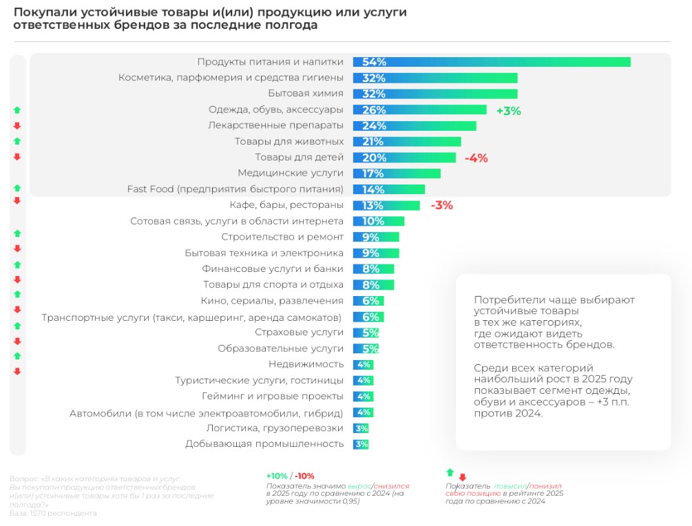 Доля покупателей, которые приобретают продукцию ответственных компаний, увеличилась с 26% в 2024 г. до 32% в 2025 г., говорится в исследовании E+ Change и Better by Okkam.