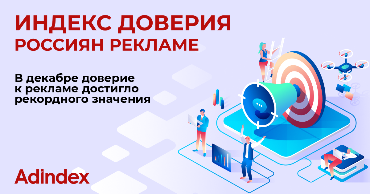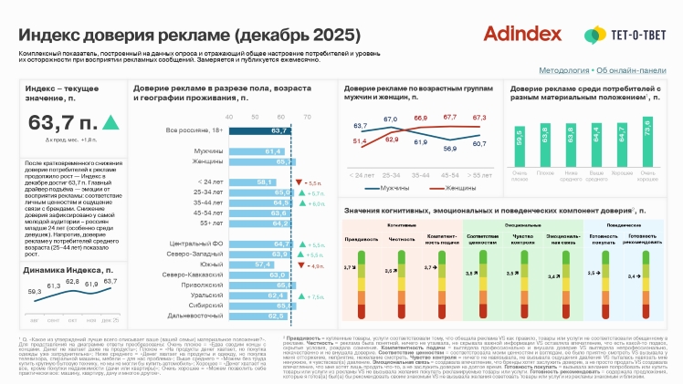 По итогам декабря индекс доверия рекламе (совместный проект Adindex и «Тет-о-твет») вырос до 63,7 пункта из 100, прибавив 1,8 п. к ноябрю. После осенних колебаний показатель вновь перешел в зону роста и достиг рекордного значения за все время исследования.