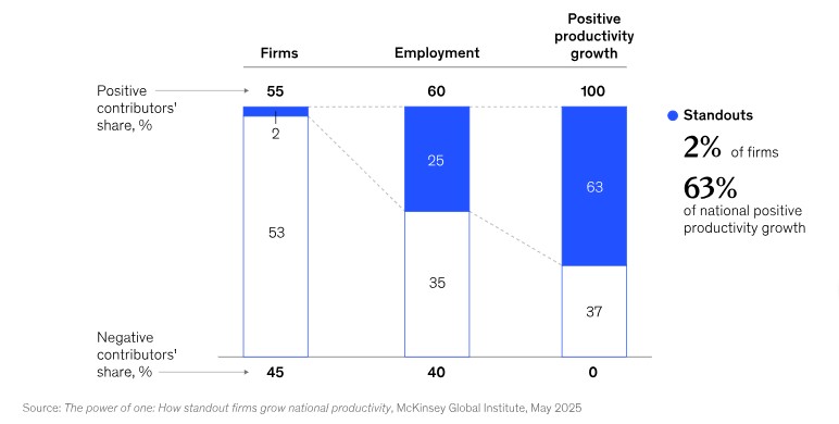 Около 100 компаний из 8,3 тыс. крупных фирм обеспечили 63% роста производительности в анализируемых странах. Согласно данным исследования, они двигают экономику не постепенно, а резкими скачками, меняя стратегии и перестраивая бизнес-портфели.
