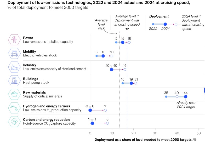 Развитие низкоуглеродных технологий идет со скоростью, составляющей лишь половину от необходимой для достижения целей Парижского соглашения к 2050 г. К концу 2024 г. внедрено лишь 13,5% от требуемого объема технологий. Прогресс есть в электроэнергетике, транспорте и добыче сырья, но практически отсутствует в водородной энергетике и тяжелой промышленности.