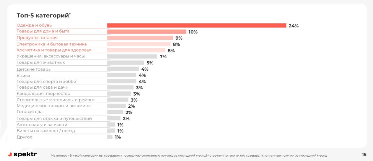 Среди категорий лидируют спонтанные покупки одежды и обуви (их указали 24% опрошенных). Далее следуют товары для дома и быта, продукты питания, а также электроника и бытовая техника.