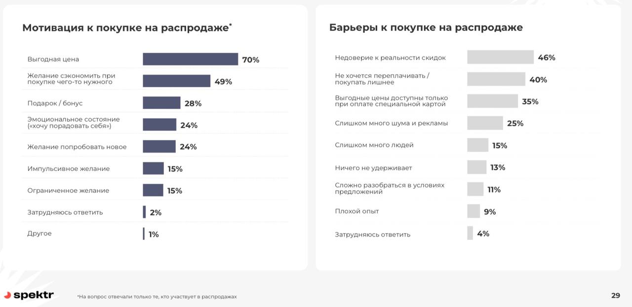 Свыше половины участников опроса (62%) покупают на распродажах нужные товары. Большая часть участвует в них из-за выгодной цены (так ответили 70% респондентов), а 49% ― из-за желания сэкономить. Барьерами к покупкам во время распродаж выступают недоверие к скидкам и нежелание переплачивать. Так, 63% считают скидки искусственными, а 74% перепроверяют их перед покупкой.