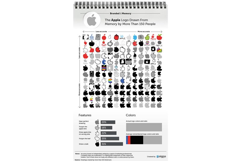 Самой распространенной ошибкой стал рисунок стебля, которого нет в логотипе, ― этот элемент изобразили 31% американцев. Четверть участников исследования не добавили лист, а 22% перепутали, с какой стороны надкусано яблоко. Причем 16% вообще забыли об этом элементе и нарисовали яблоко целым. Также встречались варианты яблока в красном цвете и с радужной палитрой ― последняя версия логотипа действительно существовала в 1977–1998 гг.