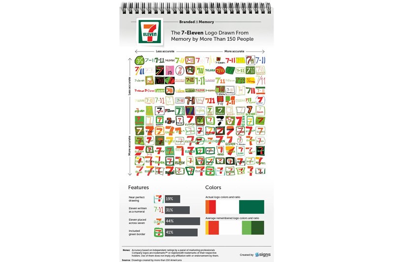 Компания практически не меняла логотип с момента своего появления, поэтому большинство смогли воспроизвести его без серьезных ошибок. Тем не менее более чем в половине версий (56%) слово eleven размещено под цифрой 7, а не посередине. Еще 31% участников изобразили этот элемент числом. При этом аналитики отметили, что двое американцев (меньше 1%) вспомнили, что знак n пишется с маленькой буквы.