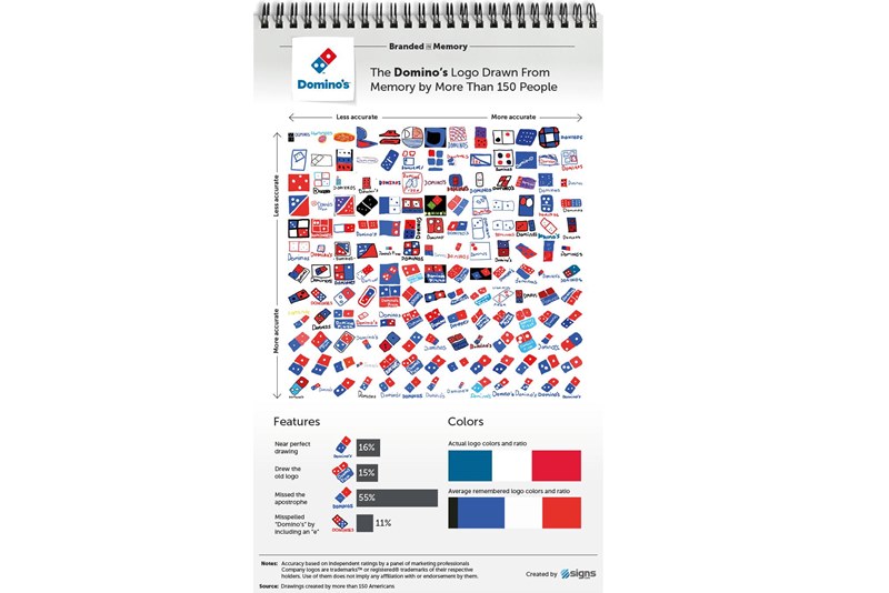 Большая часть (55%) упустила апостроф. Вместе с этим 11% добавили лишнюю букву и написали бренд под названием Dominoe’s. Кроме того, у участников возникли трудности с точками. Правильное количество (три) нарисовали 28%, в то время как 37% изобразили больше, чем нужно, а 14% вообще забыли про них. Также 15% воспроизвели прошлый логотип, использовавшийся компанией до 2012 г.