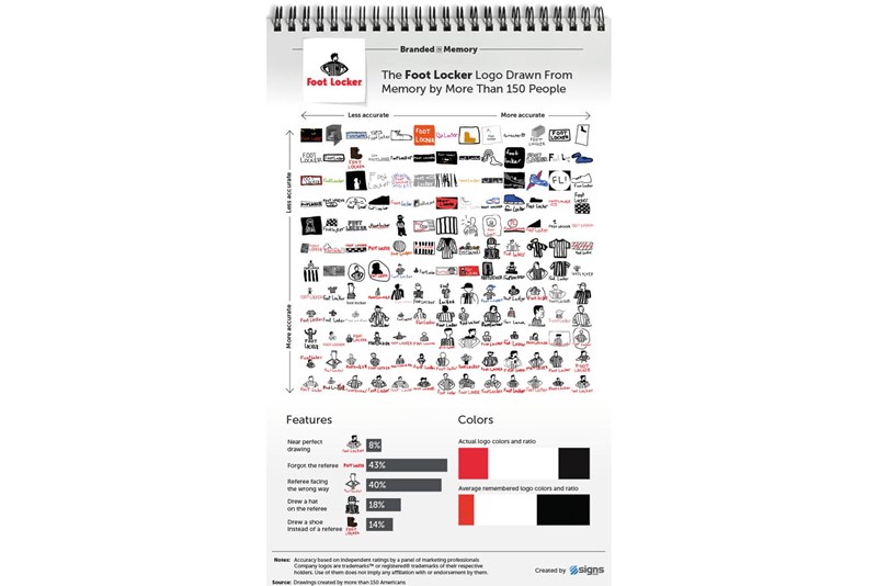 Почти половина участников (43%) забыли, что на логотипе есть человек, причем значительная часть (40%) перепутала, в какую сторону он смотрит. Также 18% добавили ему бейсболку, а 14% вместо человека нарисовали ботинок.