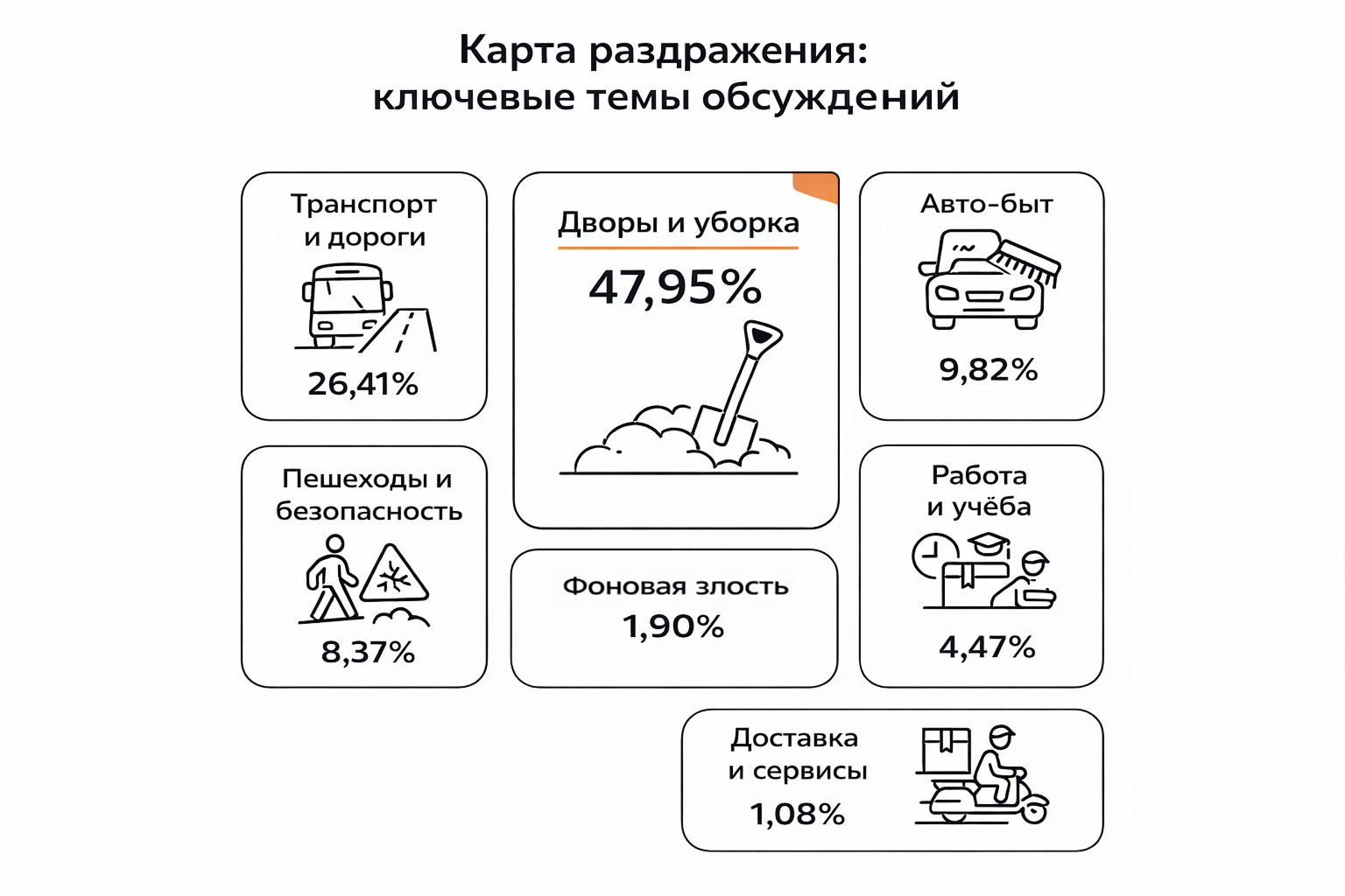 Почти половина всех жалоб онлайн (≈ 47,9% изученных материалов) касалась уборки дворов и территорий рядом с домом: сугробы мешали добраться до машин и остановок. Чуть больше четверти постов (26,4%) были посвящены тому, что из-за снегопадов сбилось расписание общественного транспорта, срывались сроки доставок, а люди опаздывали на работу.