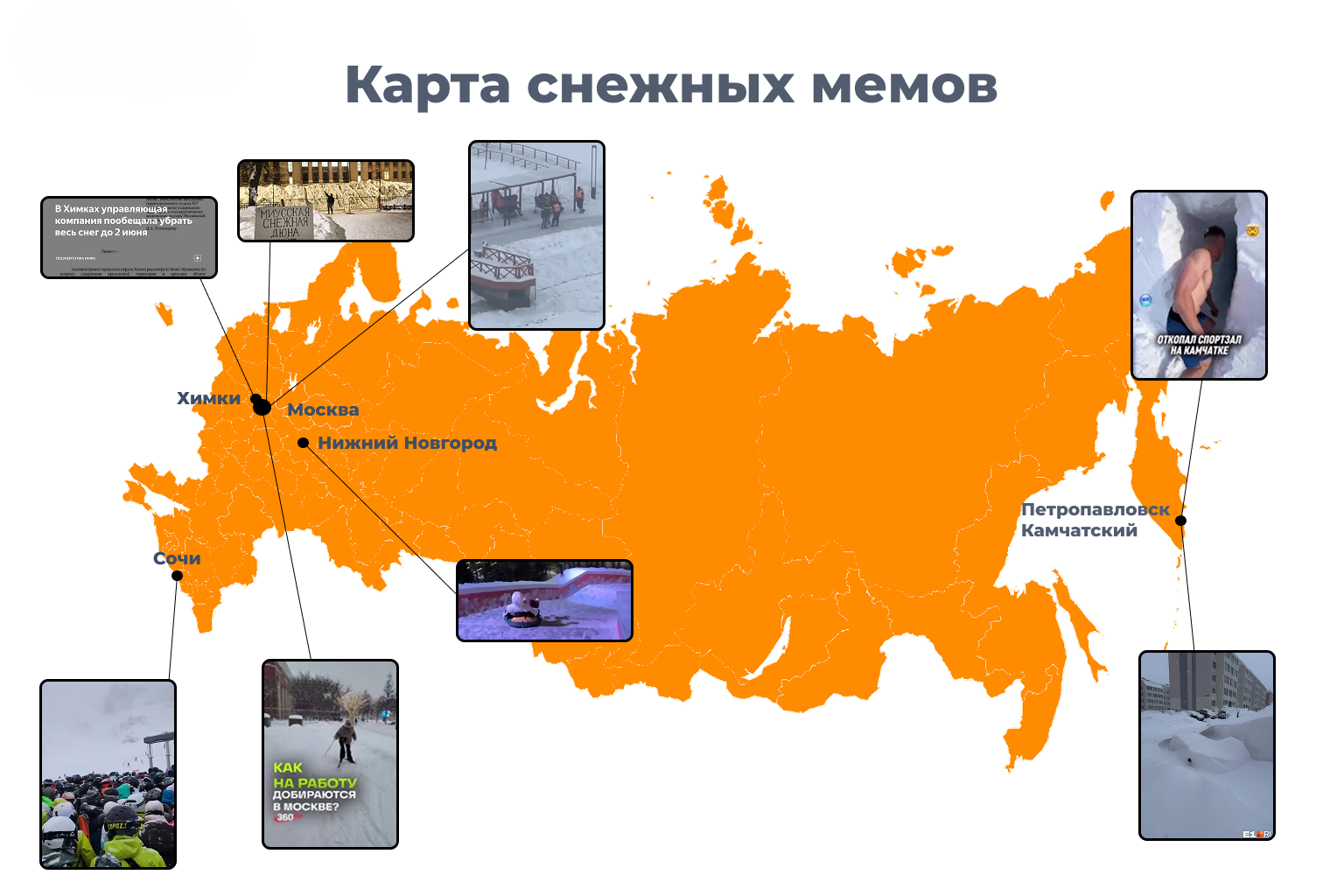 Лидирующими типами площадок-трансляторов недовольства граждан стали соцсети (46%) и мессенджеры (28%). Отмечается, что со спадом первой волны раздражения город, борющийся с аномальными осадками, стал площадкой для создания пользовательского контента, часто ироничного (переход от жалобы к шутке). Символами времени стали большие сугробы: реальные, наподобие московской «Миусской дюны», и цифровые, как «сугробы до 9 этажа» на Камчатке, созданные с помощью ИИ. Стихия также монетизируется: сильно вырос рынок предложений по самостоятельной уборке снега и откапыванию автомобилей.
