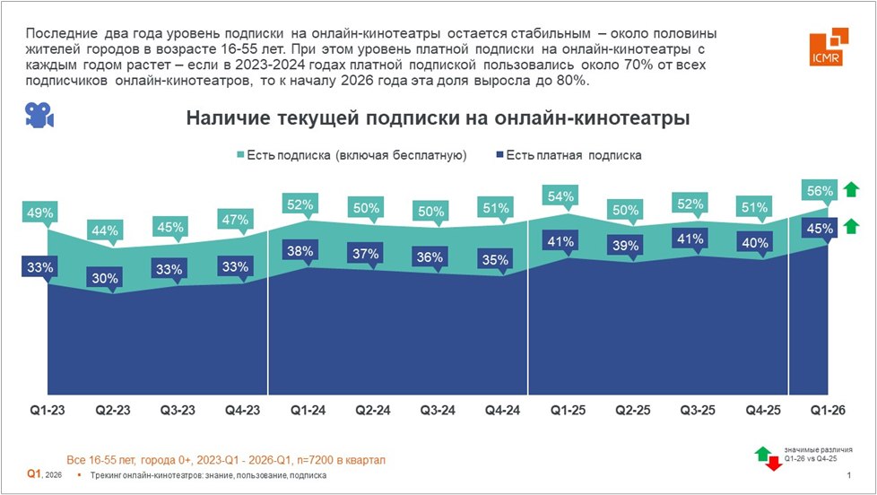 56% горожан пользовались подписками на онлайн-кинотеатры (включая бесплатные и пробные периоды) в первом квартале 2026 г. Исследовательская компания ICMR (ООО «ГФК-Русь») опубликовала рейтинг онлайн-кинотеатров в России за первый квартал 2026 г. Данные есть в распоряжении AdIndex.