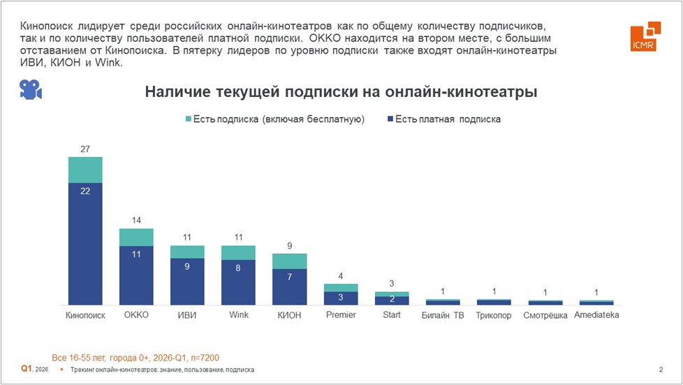 Подпиской на «Кинопоиск» в первом квартале 2026 г. пользовались 27% жителей российских городов. В четвертом квартале 2025 г. эта доля составляла 23%. Доля платящих подписчиков «Кинопоиска» выросла с 19 до 22%. Это исторический максимум для российских онлайн-кинотеатров.