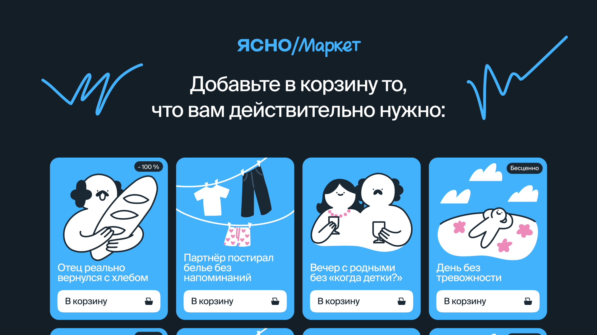 Сервис онлайн-психотерапии «Ясно» создал маркетплейс, на котором можно добавить в корзину не материальные вещи, а то, что действительно нужно нашей психике каждый день. Идея была реализована к распродаже в честь Черной пятницы, поясняют в пресс-службе.