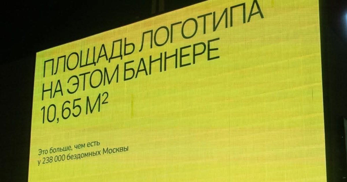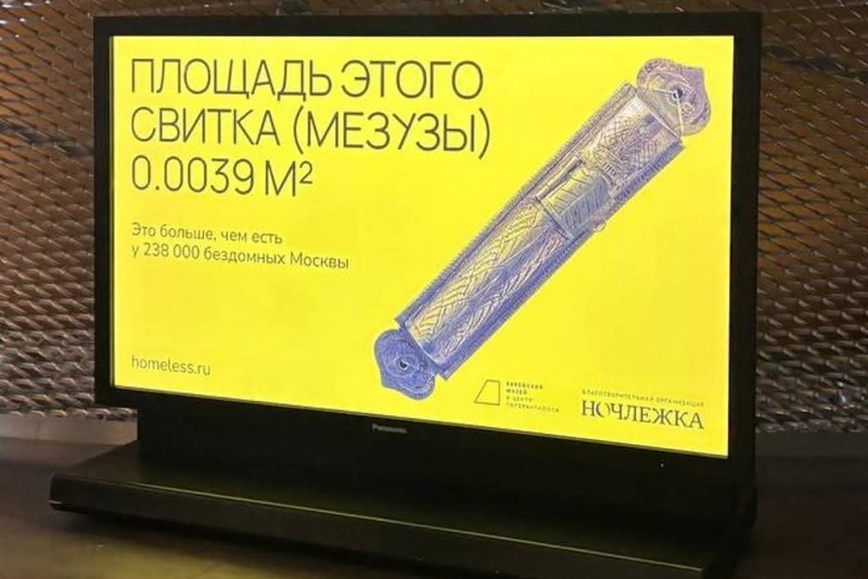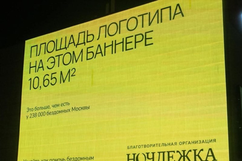 Благотворительная организация «Ночлежка» совместно с креативным агентством Great представила проект «Жилплощадь». Основной посыл кампании заключается в сравнении размеров рекламного стенда и пространства, которым располагает бездомный человек.