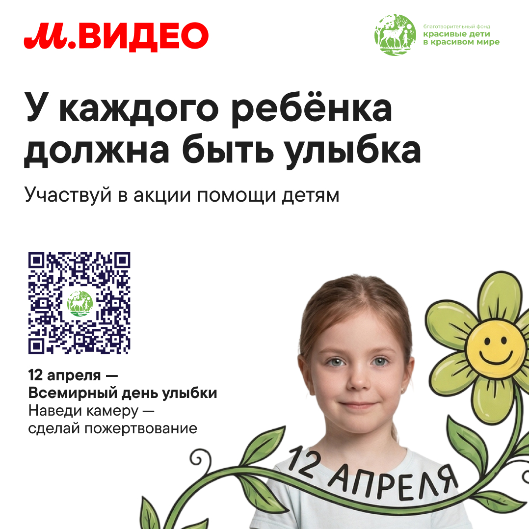 Сеть «М.Видео» совместно с партнерами проведет масштабную благотворительную инициативу ко Всемирному дню улыбки. Компании разместят символ улыбки рядом со своими логотипами на сайтах, чтобы привлечь внимание к фонду «Красивые дети в красивом мире». Все переходы будут вести на страницу помощи, где пользователи смогут сделать пожертвование. Об этом AdIndex рассказали в пресс-службе торговой сети.