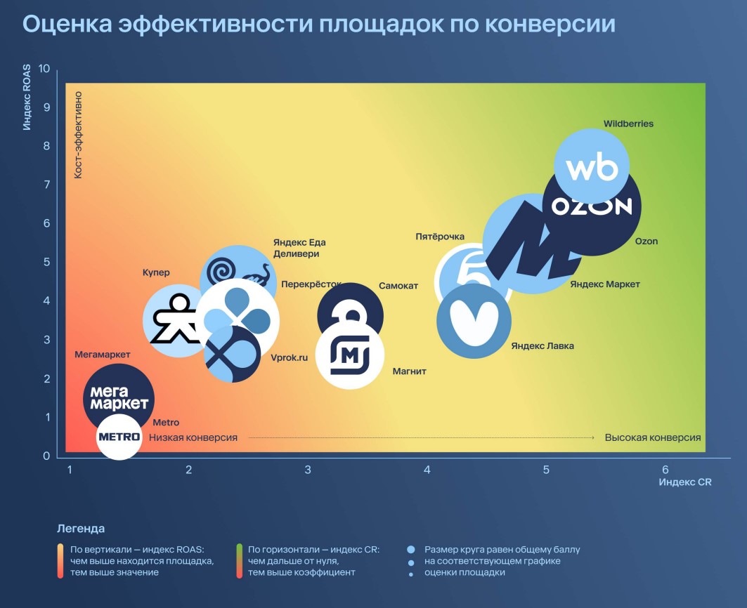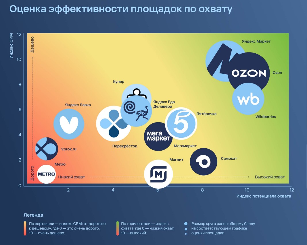 Исследователи назвали Ozon, «Пятерочку» и «Деливери» в числе лидирующих брендов FMCG. В том числе Ozon, Wildberries и «Яндекс Маркет» подходят для охвата и брендинга из-за качественного контакта с аудиторией, а «Пятерочка», «Самокат» и «Яндекс Лавка» ― для конверсии и роста продаж, по словам компании.