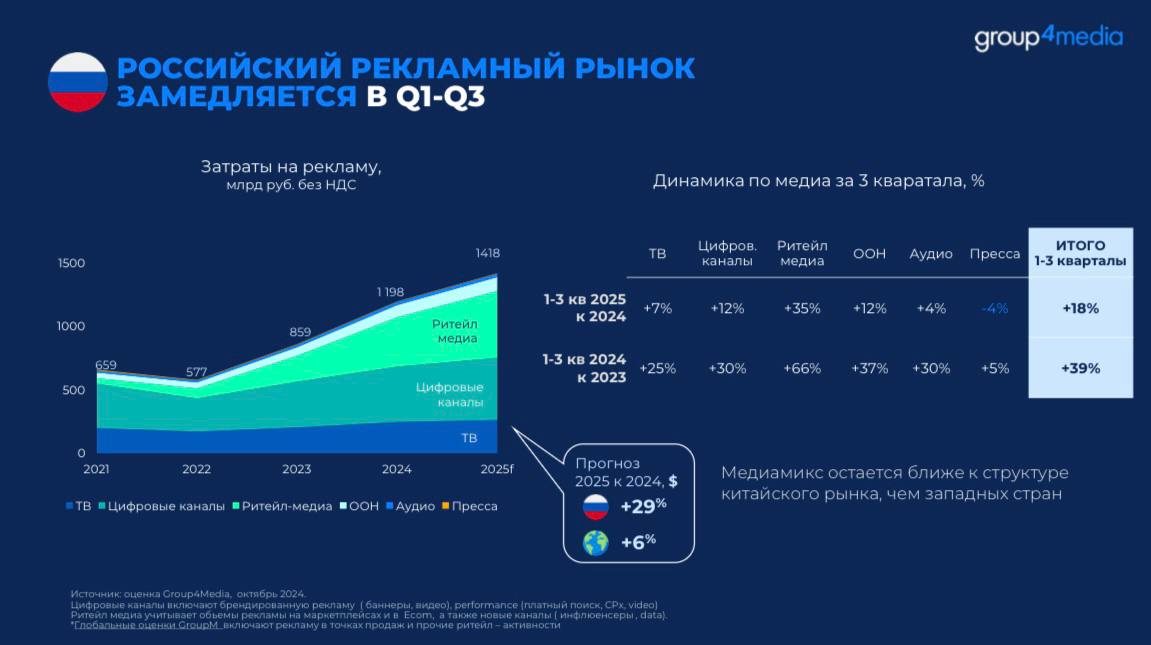 Согласно прогнозу компании, объемы российского рынка рекламы в долларовом выражении могут увеличиться на 29%, в то время как глобального ― на 6%. За первые девять месяцев 2025 г. динамика в медиа составила 18%. Драйвером роста остается ретейл-медиа, рекламные расходы на который увеличились на 35%. Рост также показали: цифровые каналы (+12%), рынок наружной рекламы (+12%), ТВ (+7%) и аудио (+4%). При этом затраты на продвижение в прессе снизились на 4%.