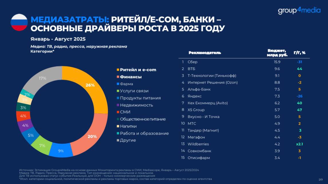 Лидерами по расходам в четырех крупнейших медиа (ТВ, радио, пресса, наружная реклама) без учета интернета среди рекламодателей остаются сегменты ретейла и e-com с суммарной долей рынка в 26%, а также финансы (20%). При этом из топ-15 заметно сократили бюджеты в январе — августе этого гогда два рекламодателя: «Сбер» (на 31%) и «Яндекс» (на 26%). В это же время в рекламу начали больше вкладываться X5 Group (+47%), ВТБ (+44%), Avito (+40%) и Wildberries (в 2,1 раза).
