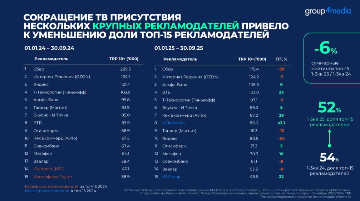 Эксперт также отметила, что падение телесмотрения остановилось в 2025 г., аудитория растет за счет детских телеканалов на фоне сокращения YouTube-потребления. При этом крупные рекламодатели уменьшили свое присутствие на ТВ на 2% (с 54 до 52%), суммарные рейтинги топ-15 компаний упали на 6% год к году, согласно данным Group4Media. Так, «Сбер» снизил объем закупок в TRP (пункт целевого рейтинга, отражающий, какой процент целевой аудитории увидел рекламное сообщение) на 39%, «Яндекс» ― на 34%, «Магнит» ― на 13%, Ozon ― на 7%. В то же время Avito увеличил присутствие на 29%, ВТБ ― на 23%, X5 Group ― на 22%, «МегаФон» ― на 10%, а Wildberries ― втрое.