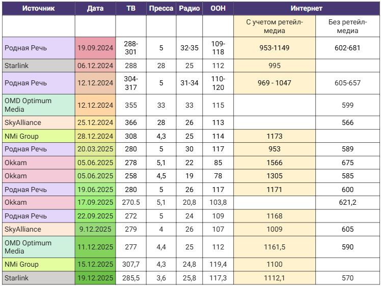 Радио и пресса окончательно консолидируются в узких нишах. Их развитие связано не с объемным ростом, а с закреплением в определенных нишах. Радио остается эффективным для локального таргетинга и фонового контакта. Пресса сохраняет влияние на старшую аудиторию с высоким доходом.