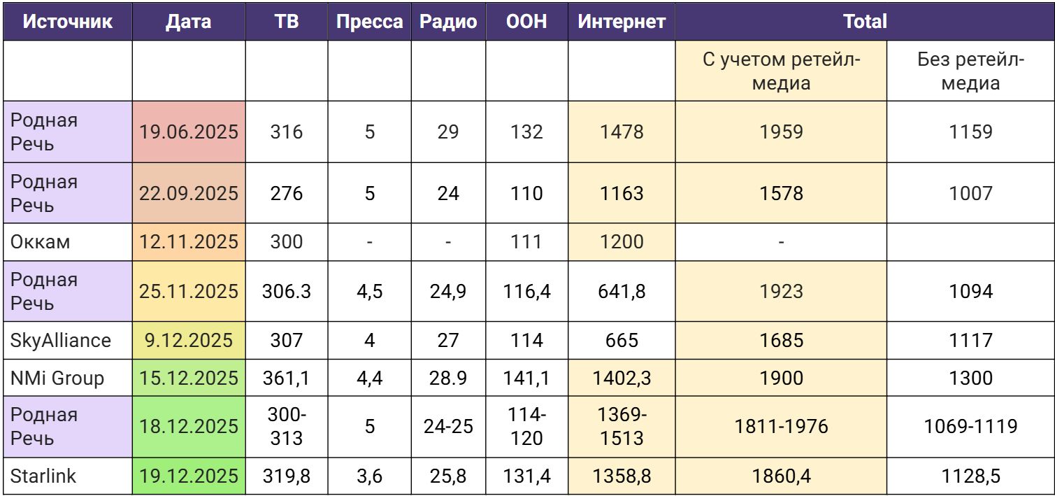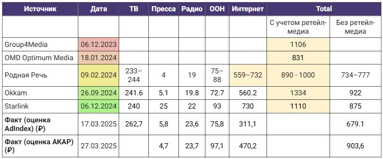** AdIndex оценивает объемы рынка только в тех медиа, где производится независимый мониторинг рекламных выходов. За рамками расчетов оказываются такие значимые сегменты, как ретейл-медиа, реклама в Telegram, спонсорство, инфлюенс и другие не отраженные в мониторинге сегменты.
