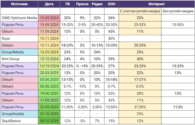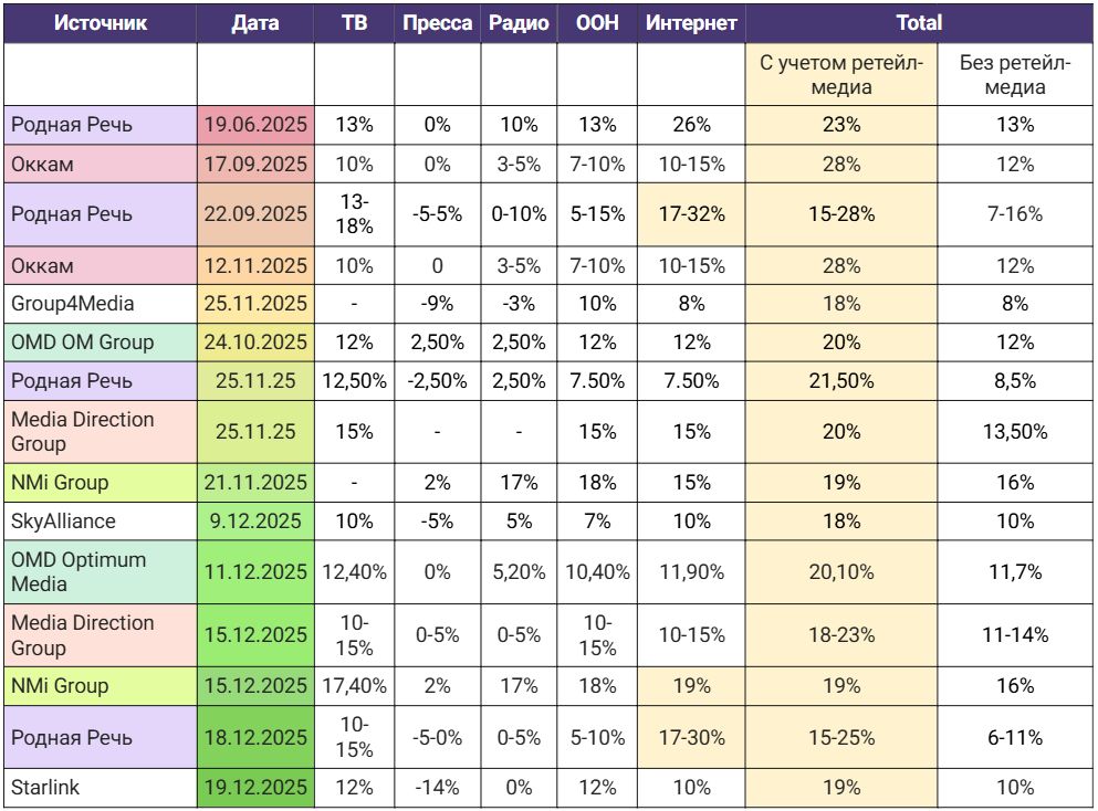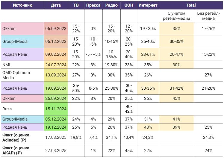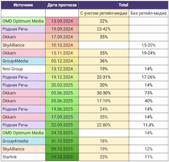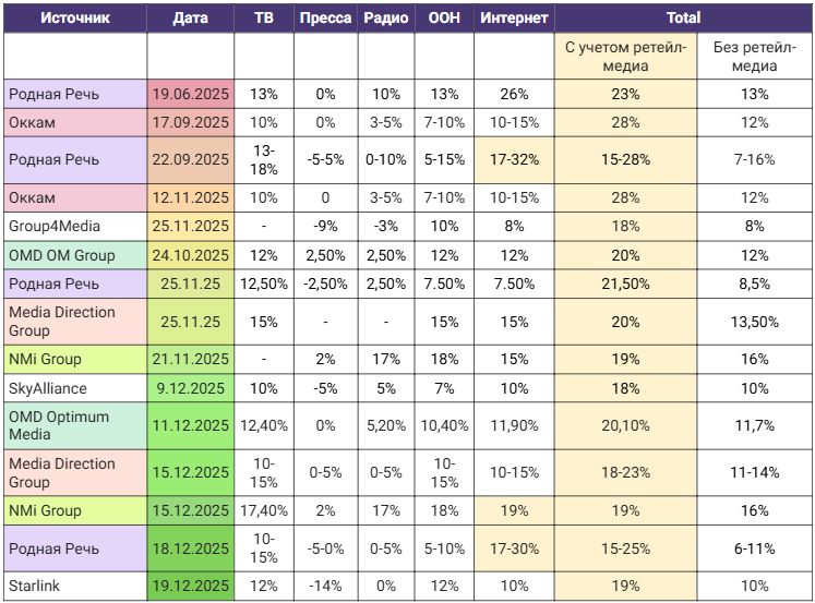 Среди медиаканалов наибольшие надежды возлагаются на ретейл-медиа и e-com (прогнозы доходили до 73% роста), и на сегмент наружной рекламы, где ожидается рост рынка до около 20-30%.