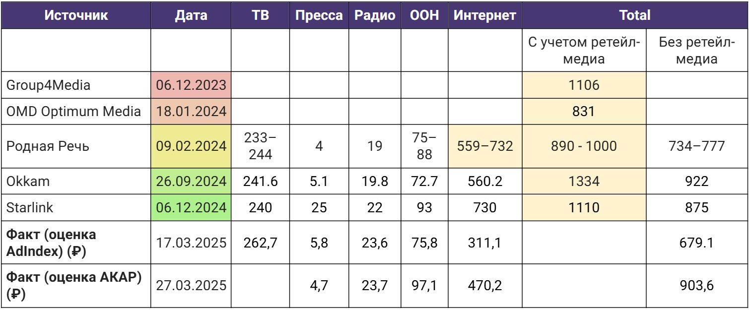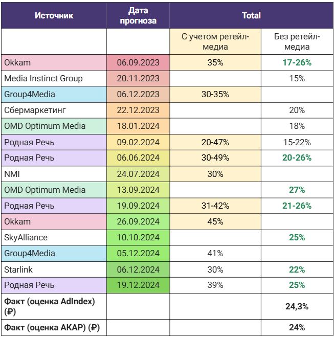 Тогда прогнозы динамики (включающие ретейл-медиа) не превышали 35%, в 2024 году рекламные группы стали немного оптимистичнее, и их оценки варьировались в среднем от 30% до 45% с учетом инвентаря маркетплейсов. Наибольший рост предрекала группа "Родная Речь" – до 49%. Точность прогнозов повышается по мере приближения к рассматриваемому периоду. Поэтому крайне важно смотреть на то, когда была дана та или иная оценка. Однако группа Okkam, чей прогноз был хронологически первым, спрогнозировала диапазон роста 17-26%, что достаточно близко к фактическому значению в 24,3%.