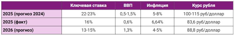 Годовая инфляция в 2025 году (на 18 декабря 2025) составила 6,64% к году, что соответствует прогнозу экспертов среди участников рынка. На следующий год ЦБ РФ прогнозирует снижение уровня инфляции до 4-5%. Курс доллара же оказался переоценен, и, достигнув максимума размером 103,4 руб/доллар в январе текущего года, в среднем держался на уровне 83,6 руб/доллар (против предреченных 100-115). В 2026 году эксперты БКС полагают небольшое ослабление курса рубля до среднего уровня 88,8 руб/доллар.