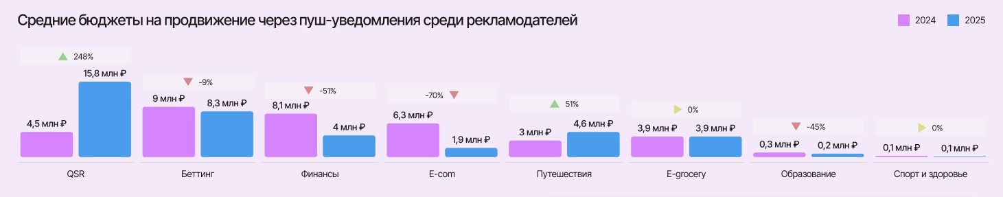 При этом в 2025 г. рекламодатели инвестировали в уведомления на 5% меньше, чем годом ранее. В частности, падение произошло в сегментах финансов (с 8,1 млн до 4 млн руб.), беттинга (с 9 млн до 8,3 млн руб.), e-com (с 6,3 млн до 1,9 млн руб.) и образования (с 0,3 млн до 0,2 млн руб.) В то же время рекламодатели нарастили продвижение в категориях QSR (с 4,5 млн до 15,8 млн руб.) и путешествий (с 3 млн до 4,6 млн руб.)
