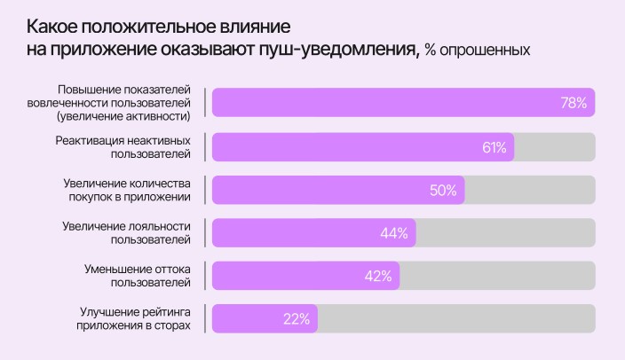Говоря об эффективности, примерно две трети респондентов (68%) указали на положительное влияние уведомлений на метрики приложения: в частности, пуши помогают увеличить активность, реактивировать неактивных пользователей и нарастить число покупок, по словам рекламодателей. При этом в сравнении с другими инструментами пуш-уведомлений менее эффективны для 48% опрошенных.